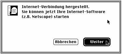 Der Start ins Internet erfolgt über das T-Online-Software Menü "Befehle", Auswahl "Internet". Wenn untenstehendes Fenster erscheint, auf "Weiter" klicken, dann mit einem Doppelklick auf das Netscape-Navigator-Symbol, Netscape starten. Sollte der Gateway belegt sein, klicken Sie auf "Abbrechen". Der Netscape-Navigator entspricht im Wesentlichen der PC-Version. Netscape automatisch starten?