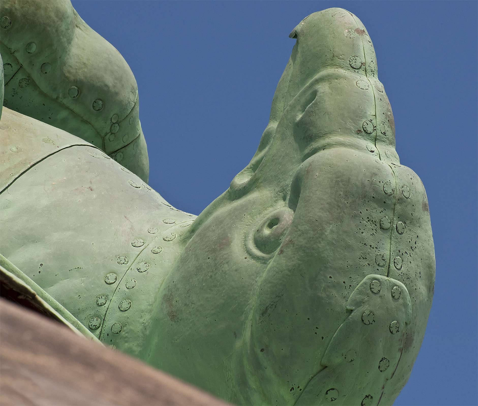 Der Kopf des Hermann - deutlich ist der Aufbau der Kupferplatten zu erkennen. Der Kopf in gross 2500 X 1264 Pixel - bitte in den Text klicken |