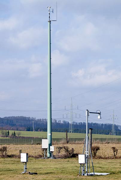 Der Windmessmast, hier wird in 10m Höhe Geschwindigkeit und Richtung gemessen.